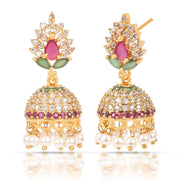 Gold Plated Floral Jhumka Earrings with pink and green stones, pearls, and white crystals.
